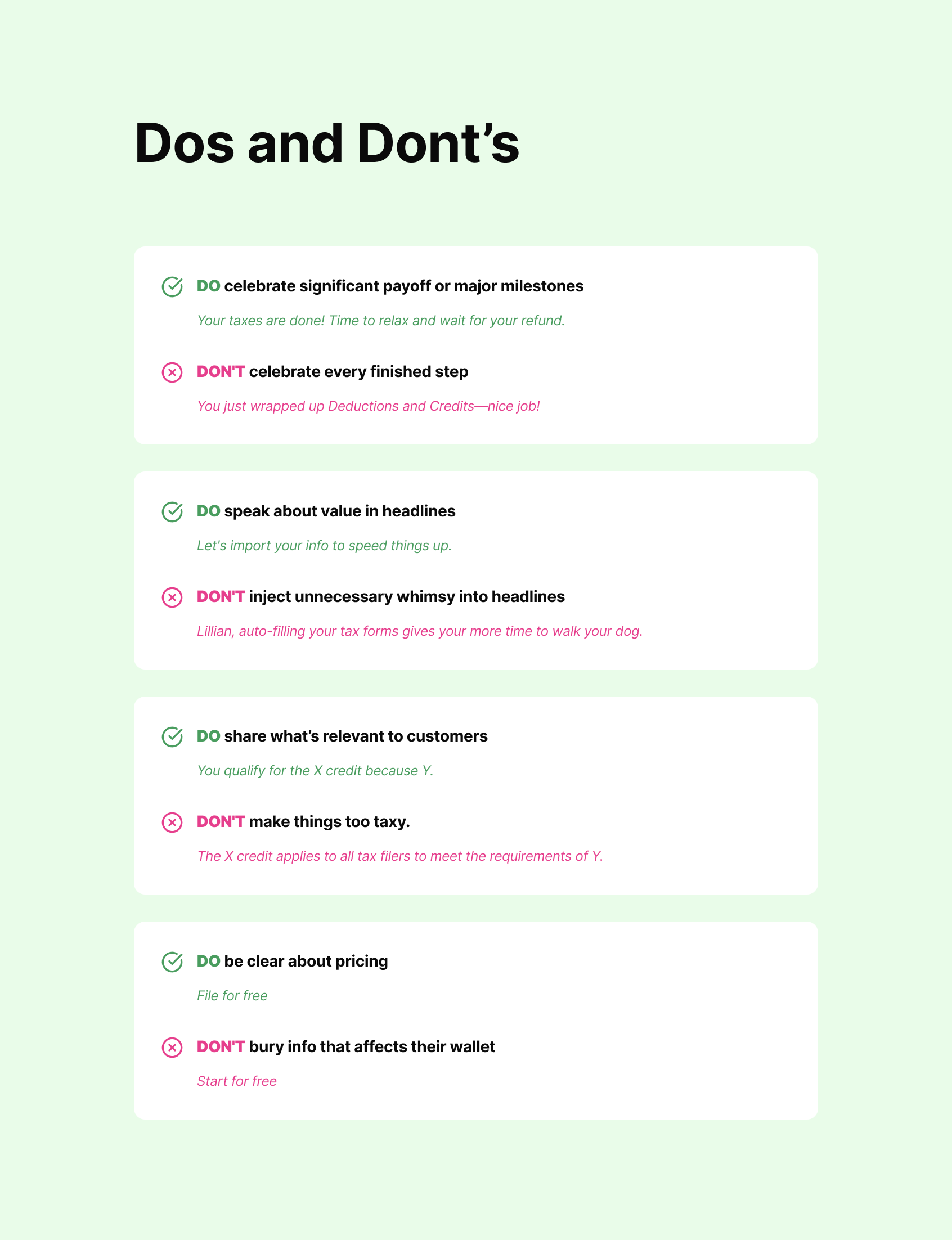 Crafted our voice and mapped out tone considerations, dos and donts for different points in the filing process.