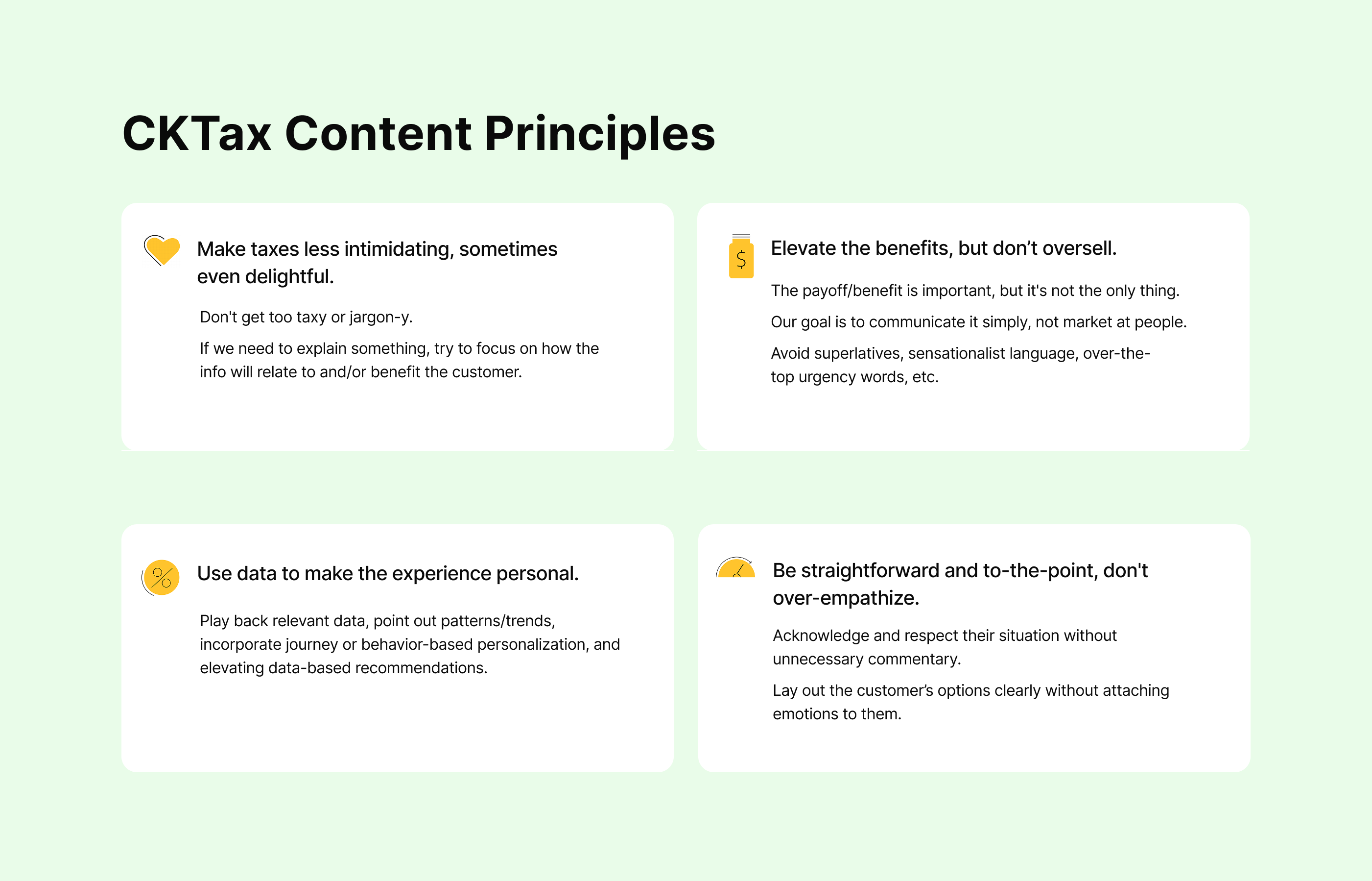 These docs acted as more than a style guide, they told people who CKTax was and how we were positioning ourselves in the tax landscape. We were an antitode to overly technical products, we'd win on transparency where others obscure, and we're for people who don't identify as "tax people".